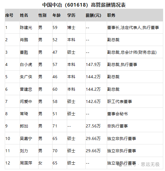 以下表格(数据来源于2024年年报)展示了中国中冶部分管理层人员的相关情况,包括姓名、性别、年龄、学历、薪酬以及职务等信息。其中薪酬是指报告期(年报报告期跨度为一年,但因为有的高管调动问题,报告期内不一定完全在本上市公司,所以有的高管薪酬也未覆盖全年)内从公司获得的税前报酬总额。